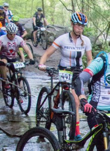 I decided to stay close to my friend (and cycling hero), Amy Phillips. She was racing for fun but as a seasoned pro road racer, I knew she’d keep a steady pace that would help me warm up (and help ease my mind being close to someone I knew in the single track).